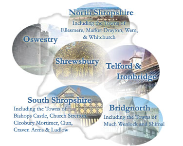 North Shropshire District - You'll find peaceful countryside and a unique landscape of sandstone hills, Meres and Mosses, and the four pretty little market towns of Ellesmere, Wem, Whitchurch and Market Drayton where old fashioned service and a warm welcome awaits. |
